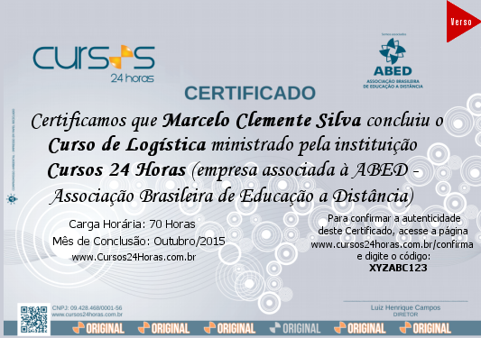 Imediatamente após concluir o curso já é possível visualizar e imprimir uma cópia do certificado no próprio site. O original é enviado pelos correios diretamente para o aluno, sem custo adicional.